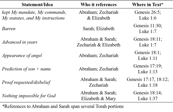 M.D. Goulder suggests several parallels between Abraham/Sarah of the Genesis Text and Zechariah/Elizabeth of the Luke Text (see table).